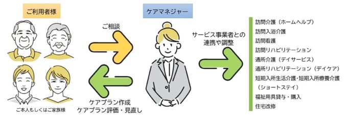 適切なサービスをご利用いただくために、ご利用者様の状態やご家族の要望を伺い、サービスを行う事業所の選定、事業者との連携、ケアプランの変更が起きた場合の調整を行います。
